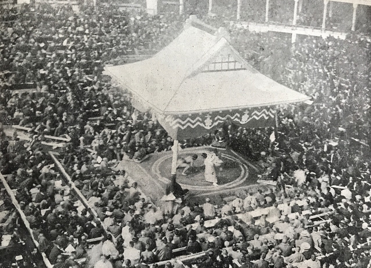 土俵の上に吊るされている屋形は元々4本の柱で立っており、昭和27年(1952)九月から「吊り屋根」になりました。さてなぜ柱を撤廃したのでしょうか?