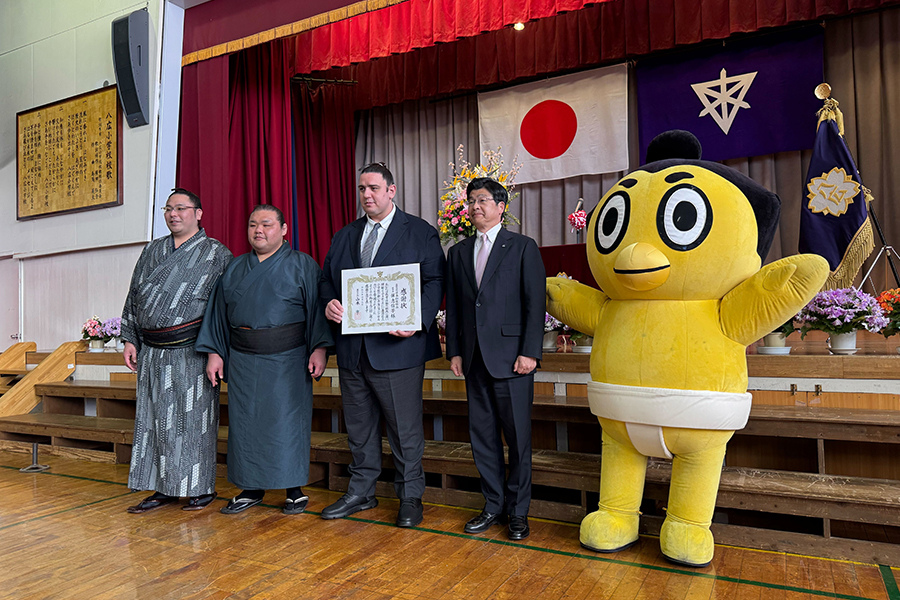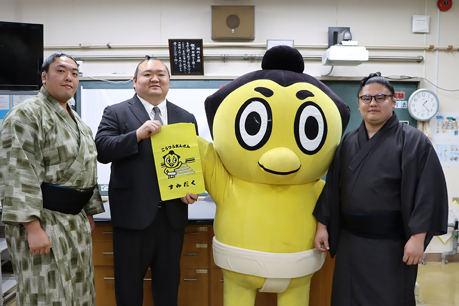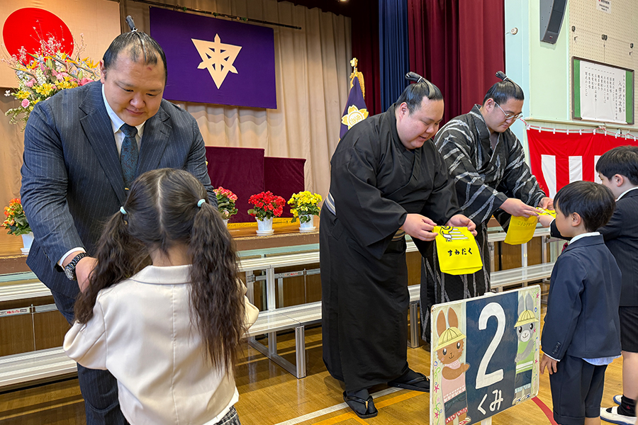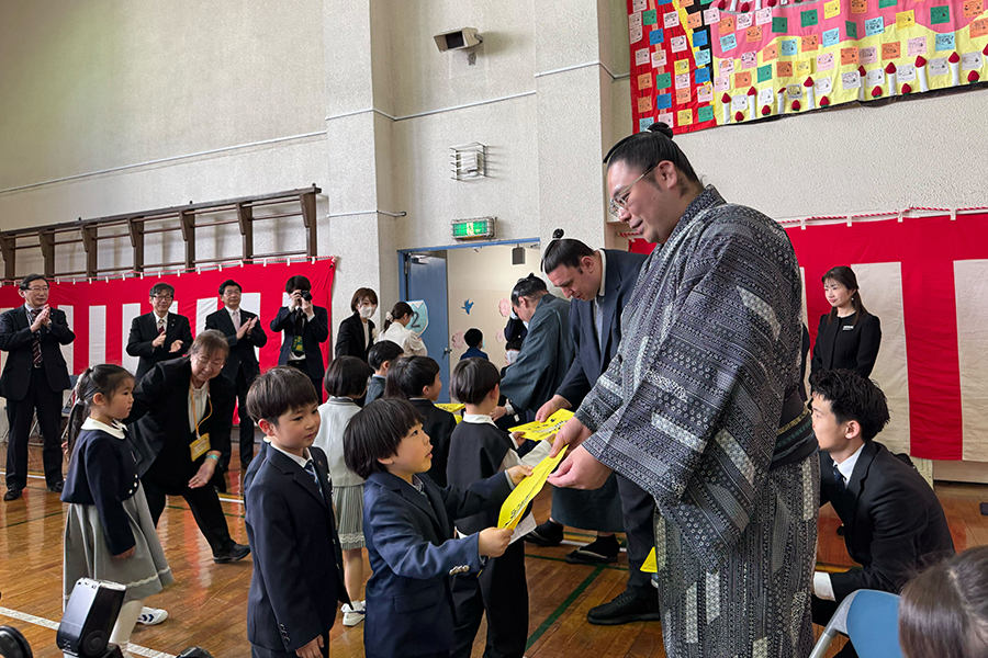 墨田区内の小学校では親方と力士、ひよの山ファミリーが出向いて渡しました。