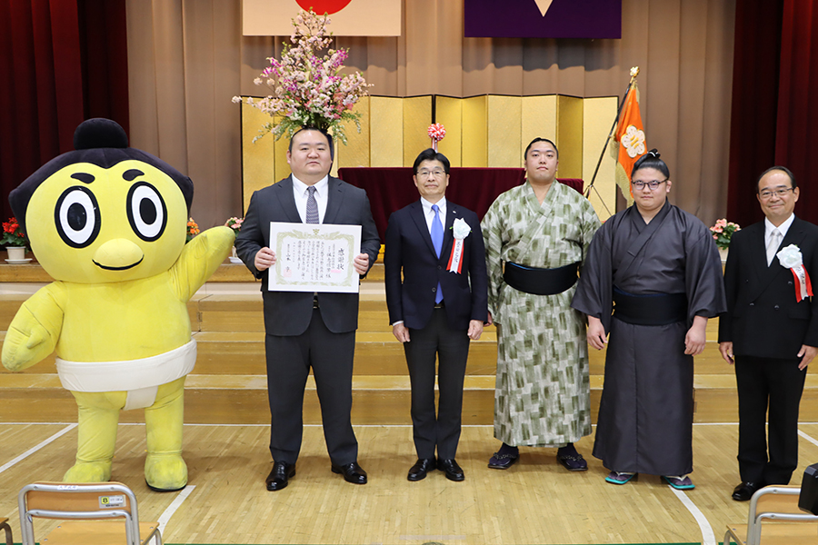 写真は山本亨墨田区長と社会貢献部の三保ヶ関親方、岩友親方、清見潟親方、ひよの山。