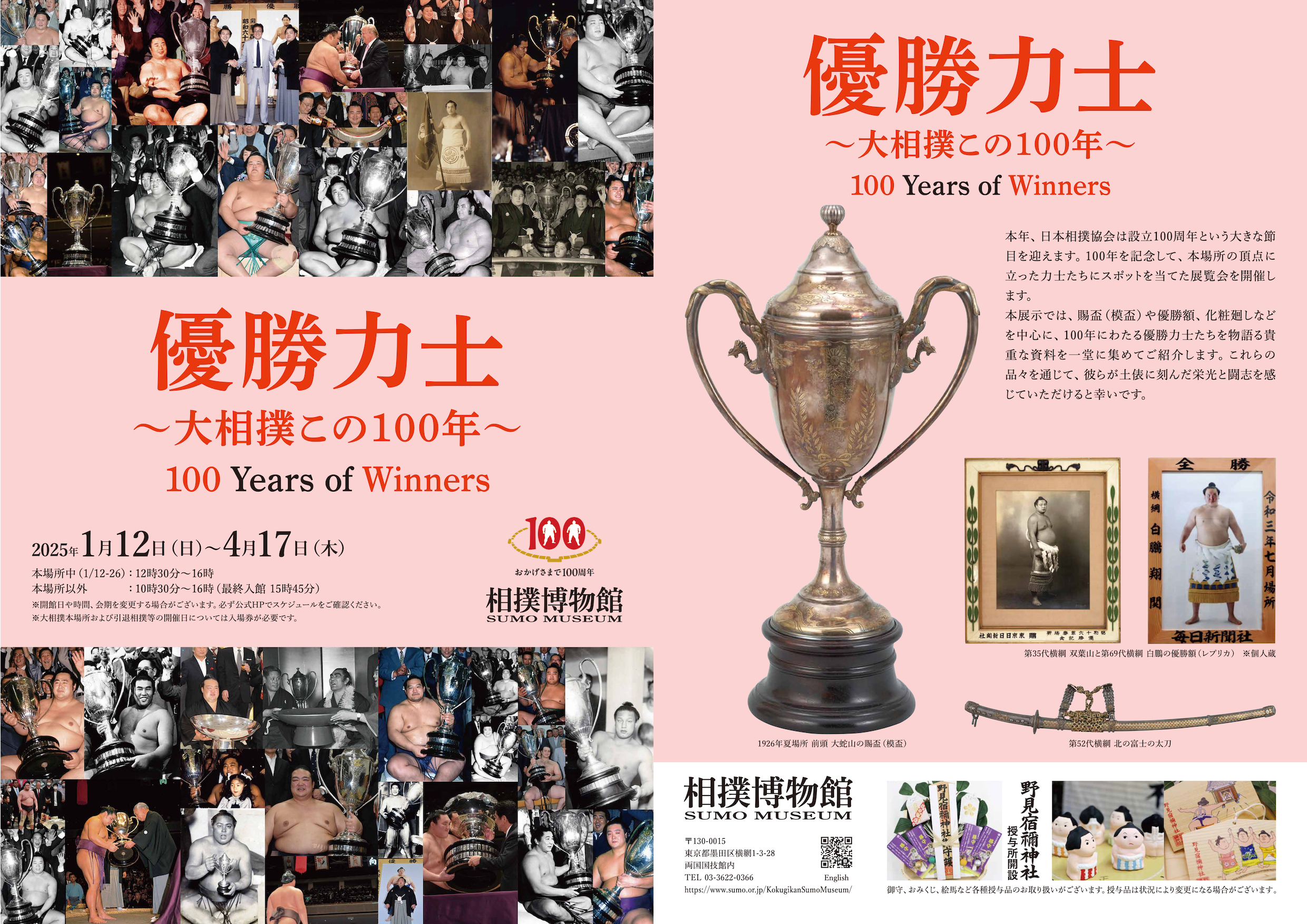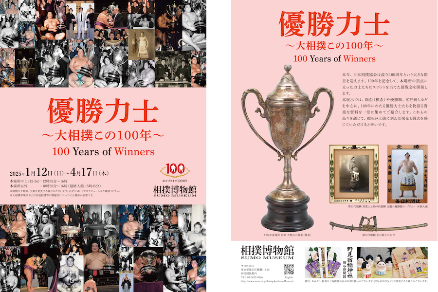 本年、日本相撲協会は設立100周年という大きな節目を迎えます。100年を記念して、本場所の頂点に立った力士たちにスポットを当てた展覧会を開催します。本展示では、賜盃(模盃)や優勝額、化粧廻しなどを中心に、100年にわたる優勝力士たちを物語る貴重な資料を一堂に集めてご紹介します。これらの品々を通じて、彼らが土俵に刻んだ栄光と闘志を感じていただけると幸いです。