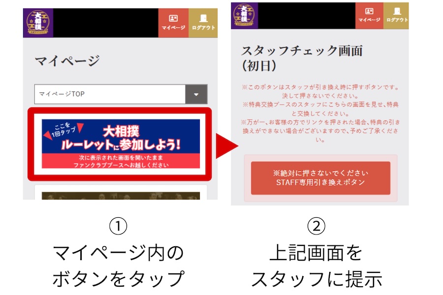 | これから会員登録される方 | ①「大相撲公式ファンクラブ」HPにアクセスしてください。 ②画面右上の「新規登録」ボタンより会員登録。 ③「大相撲公式ファンクラブ」ページにログインしマイページを開く。 ④「ルーレットに参加しよう」ボタンをご自身で押してその後に開く「スタッフチェック画面」をブースでご提示ください。  |