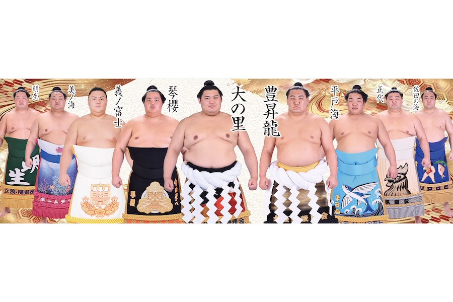 新聞4面分もの大きさに横綱・大関とご当所力士の化粧まわし姿を掲載。