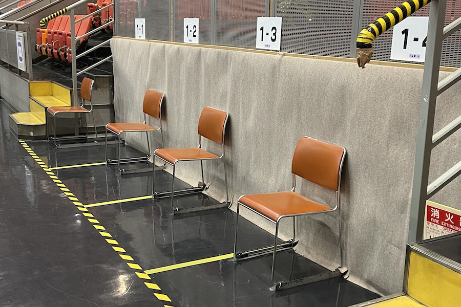 1マスは1.3m四方に鉄パイプで囲んだ中に4枚もしくは2枚の座布団を敷いたお座席です。