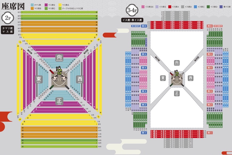 | マス席 | S席 | 正面・向正面・東・西:1〜4列目 |
