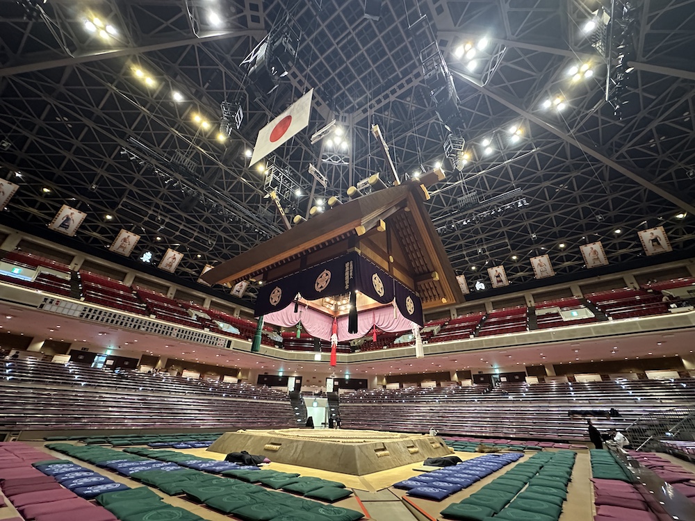 相撲記者の専用席で、執筆ができるように机が備え付けられています。