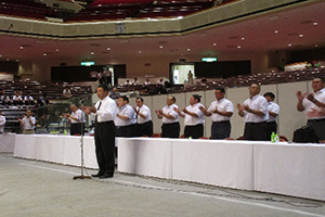 | ▲参加者の点呼を取ります。 | ▲役員並びに指導普及部の親方達。 |