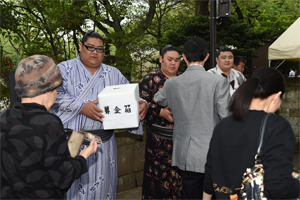 | ▲勢が、幕下力士に胸を出す | ▲熊本地震の復興支援募金を呼びかける、魁聖 |