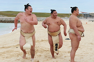 | ▲浜辺で一斉にジャンプする関取衆 | ▲ナイター興業のため、昼間は浜辺でリフレッシュした |