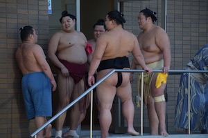 | ▲貴源治と豊ノ島 | ▲稽古後、風呂へ向かう栃ノ心と碧山 |