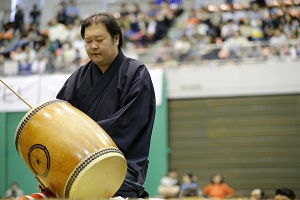 | ▲太鼓の打ち分け実演、照喜 | ▲移動中の豪栄道 |