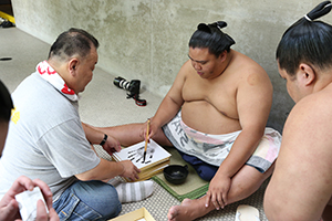 | ▲サインを書く石浦 | ▲大銀杏を結ってもらう琴奨菊 |