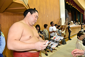 | ▲お客様にサインをする安美錦 | ▲御嶽海にいたずらする玉鷲 |