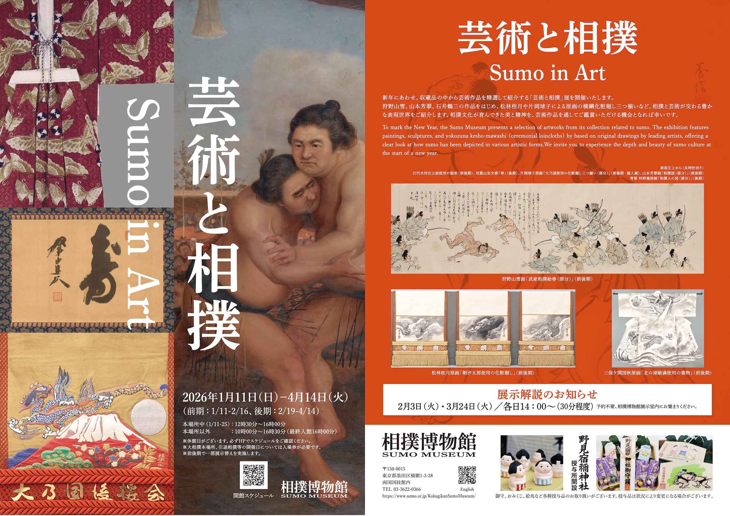 狩野山雪、山本芳翠、石井鶴三の作品をはじめ、松林桂月や片岡球子による原画の横綱化粧廻し三つ揃いなど、相撲と芸術が交わる豊かな表現世界をご紹介します。相撲文化が育んできた美と精神を、芸術作品を通してご鑑賞いただける機会となれば幸いです。
