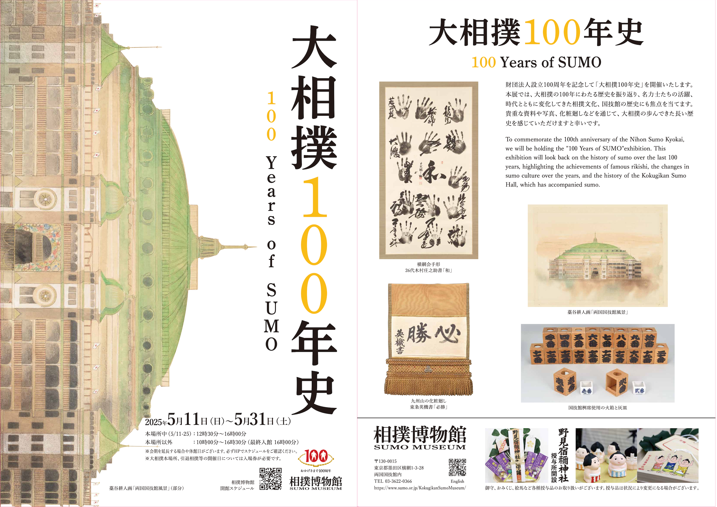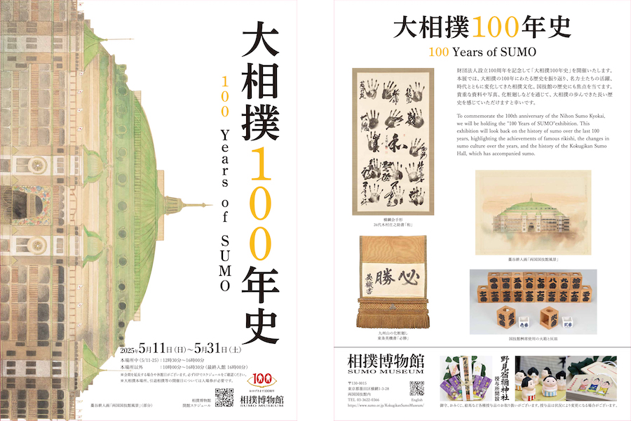 財団法人設立100周年を記念して「大相撲100年史」を開催いたします。本展では、大相撲の100年にわたる歴史を振り返り、名力士たちの活躍、時代とともに変化してきた相撲文化、国技館の歴史にも焦点を当てます。貴重な資料や写真、化粧廻しなどを通じて、大相撲の歩んできた長い歴史を感じていただけますと幸いです。