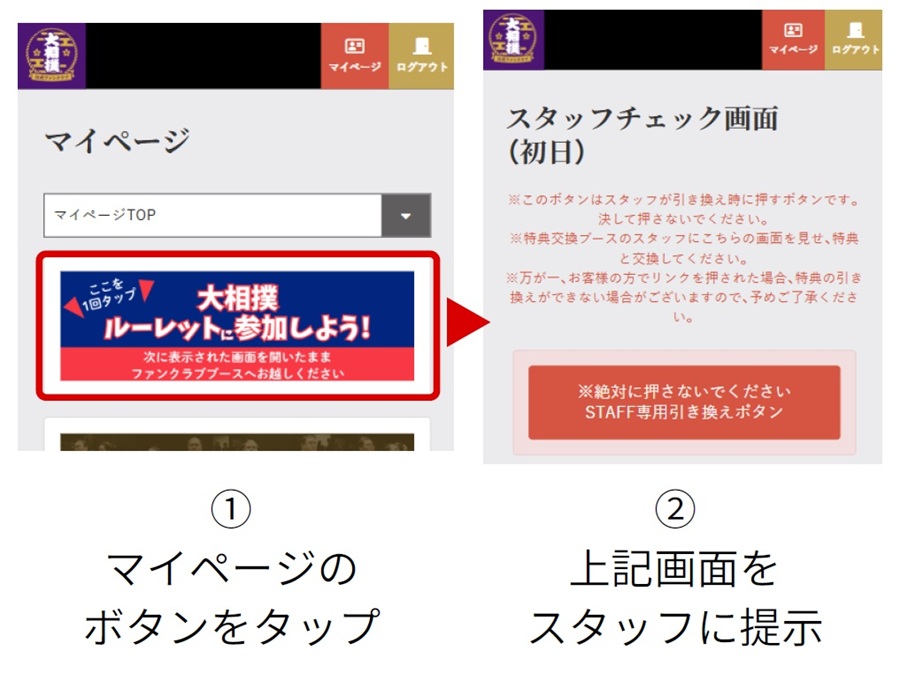 | 会員の方 | ①大相撲公式ファンクラブサイトよりログインいただき、マイページを開く。 ②「ルーレットに参加しよう」ボタンをご自身で押してその後に開く「スタッフチェック画面」をブースでご提示ください。 |