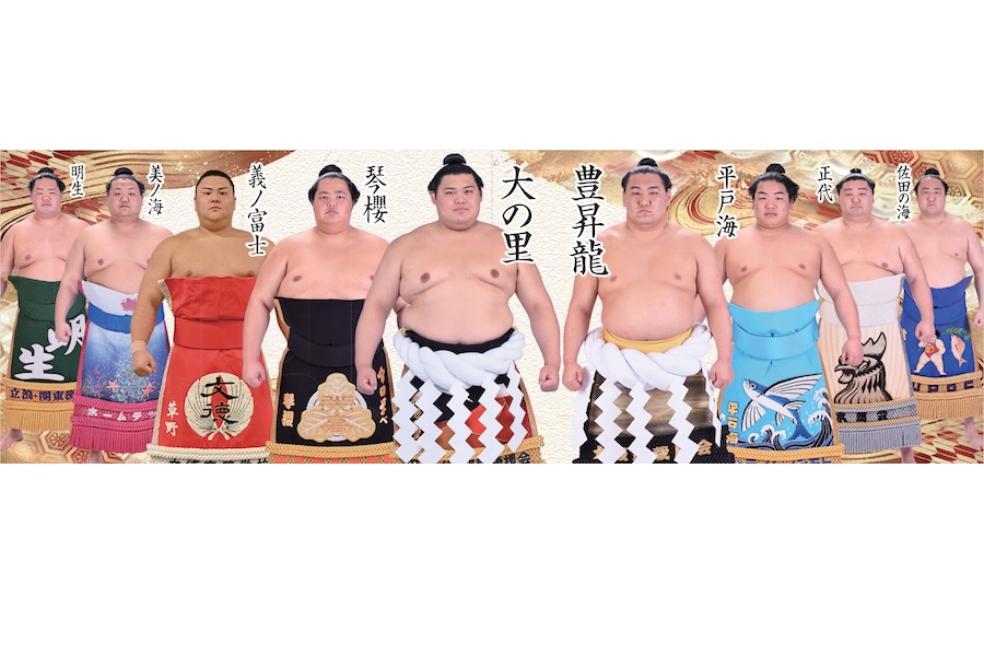 新聞4面分もの大きさに横綱・大関とご当所力士の化粧まわし姿を掲載。