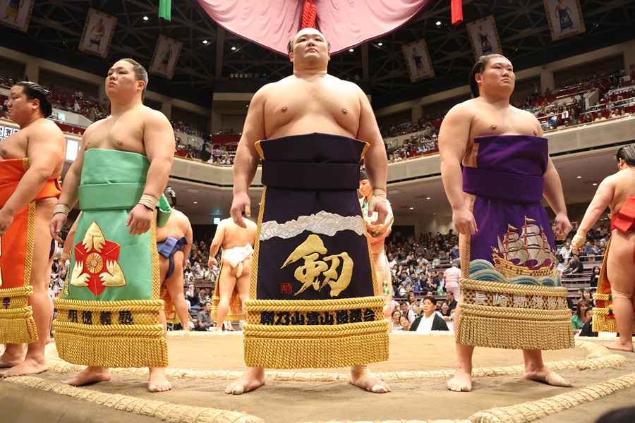 人気力士たちが色鮮やかな化粧廻しを締めて土俵を一周。相撲場の雰囲気が一気に華やぐ時間です。