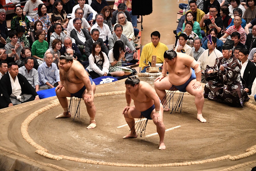 千秋楽では、結び三番を残して「三役揃い踏み」が行われます。 東西それぞれ三人の力士が土俵に上がり、扇の形で正面を向き三人そろって四股を踏む儀式に場内の雰囲気は最高潮に達します。