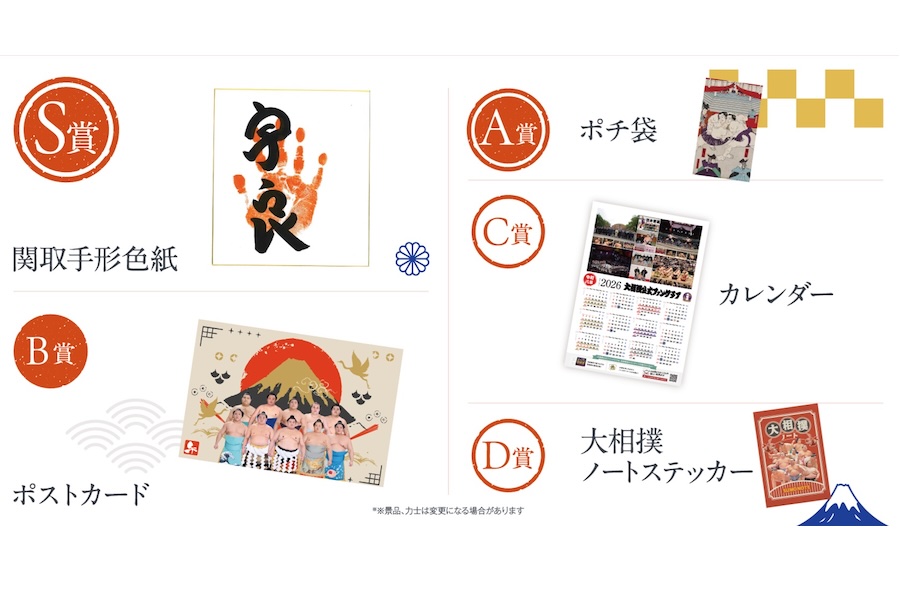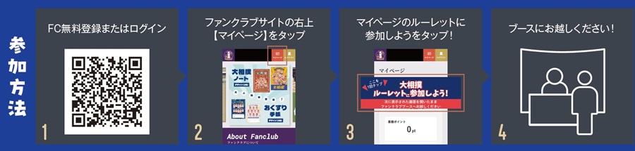 | これから会員登録される方 | ①「大相撲公式ファンクラブ」HPにアクセスしてください。 ②画面右上の「新規登録」ボタンより会員登録。 ③登録完了後、「大相撲公式ファンクラブ」ページにログインしマイページ内「ルーレットに参加しよう!」をタップしてご提示ください。 |